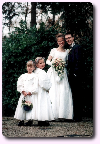 In 1998 maakte ik voor mijn trouwdag mijn bruidsjurk naar eigen ontwerp inclusief bijpassend tasje en een petticoat. Voor de bruidsmeisjes maakte ik een jurkje in