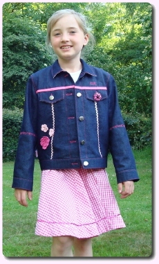 Toen een moeder mij vroeg om een jeansjasje te maken voor haar dochter met roze accenten, ben ik aan de slag gegaan en was dit het resultaat: een echt meidenjack. (mei 2009)
